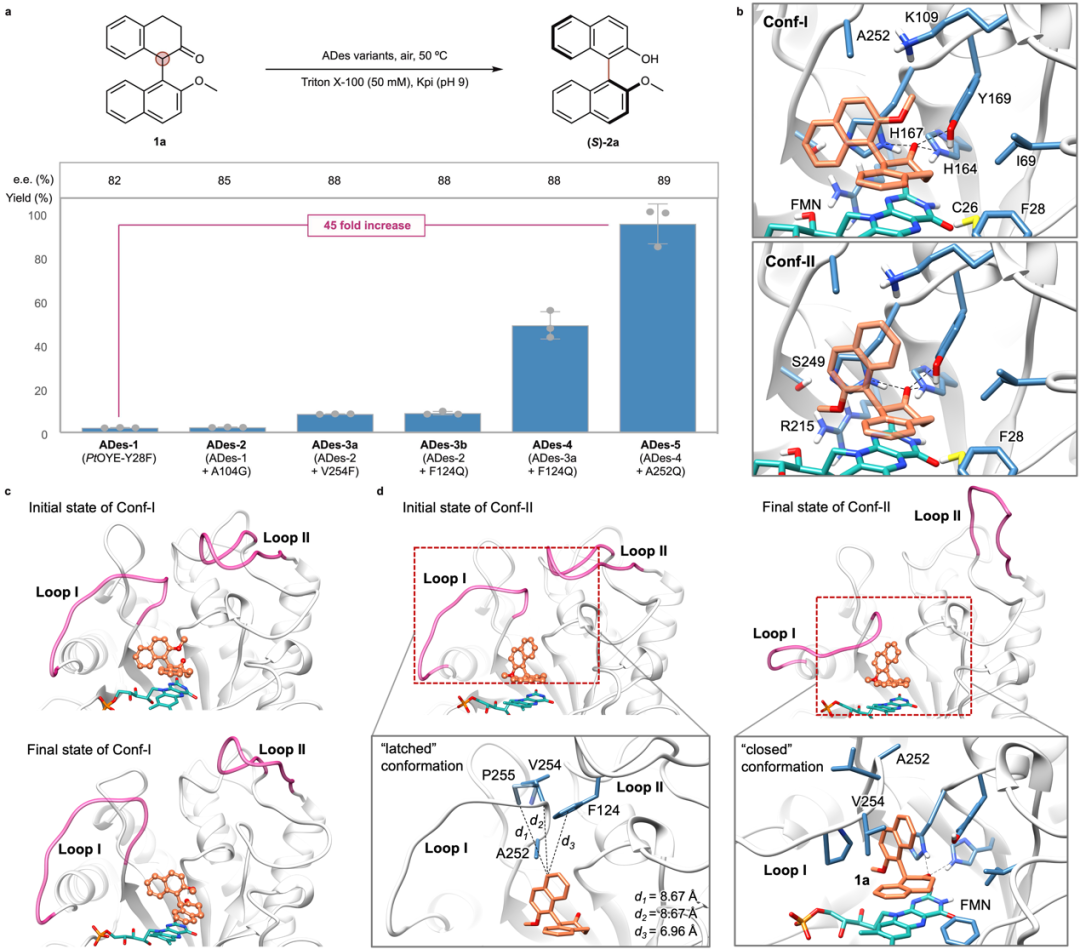 对模拟结果中的结构进一步可视化分析表明:(1) 在初始构象中,Loop II上的F124与Loop I上的P255和A252通过疏水相互作用形成“锁扣”结构,限制了Loop I的闭合;(2) 在最终的Loop I“闭合”构象中,疏水残基V254靠近底物并形成新的相互作用(图2d)。基于这些结构与动态信息,作者对F124、V254和P255三个位点进行了位点饱和突变筛选,旨在打破“锁扣”构象并稳定“闭合”构象,从而促进底物的结合和催化。筛选得到的F124Q与V254F变体分别对反应收率提升了3.8倍和3.4倍,二者组合后得到的双突变体ADes-4,使产率提升至50%,对映选择性达到88% e.e.。进一步在A252位点进行突变和筛选,获得了催化性能最优的ADes-5,其产率高达98%,对映选择性为89% e.e.,和初始变体ADes-1相比,产率提升了45倍。