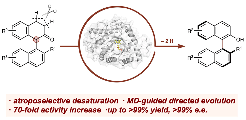 刘臻实验室与黄牛团队合作,在《Nature Synthesis》杂志发表了题为“Molecular-dynamics-simulation-guided directed evolution of flavoenzymes for atroposelective desaturation”的研究论文。该研究报道了一种基于定向进化策略开发的创新性生物催化方法,研究团队利用来源于Parageobacillus thermantarcticus的黄素酶PtOYE,通过工程化改造获得了具有对映选择性去饱和活性的变体,从而实现了轴手性联芳基化合物的高效合成。值得一提的是,分子动力学模拟 (MD simulation) 在定向进化进程中发挥了关键作用,该技术揭示了催化反应过程中酶的潜在构象变化,并在此基础上识别出此前在PtOYE及其同类酶中未被发现的重要残基。以此为指导获得的工程化酶ADes-5相较于初始变体(PtOYE-Y28F),其催化效率 (kcat/KM )提升了70倍以上。此外,研究团队通过X射线晶体学手段解析了ADes-5的结构 (PDB:9IUV),确定了其活性中心和整体的结构特征。该工程化酶能够将多种1-芳基-2-四氢萘酮底物以很高的收率和良好的对映选择性转化为相应的联芳基产物,进一步的衍生反应展示了合成产物在多官能团轴手性分子构建中的广泛应用潜力。本研究不仅展示了酶催化脱氢反应在轴手性选择性合成中的潜力,也突显了黄素酶在合成轴手性分子方面的重要能力,对有机合成与药物发现都具有重大意义。同时,本研究也验证了MD在预测蛋白质潜在构象变化并揭示蛋白功能的结构机制中的准确性和重要作用。