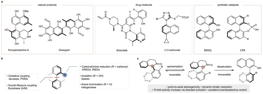 轴手性 (Atropisomerism) 是一类因单键旋转受限而形成的稳定立体异构体。与传统的手性中心不同,轴手性分子依靠空间取向的差异实现立体选择性,其构型稳定性主要取决于旋转势垒及空间位阻效应。这类化合物广泛存在于天然产物、药物分子以及手性配体和有机小分子催化剂中,具有重要的化学和生物学意义。因此,如何高效且选择性地构建轴手性化合物,一直是合成化学和生物催化领域的研究热点。