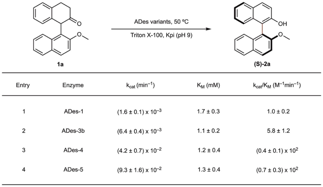 实验人员从底物1a的动态动力学拆分为切入点,开展了酶催化轴手性脱氢反应的系统研究。首先,作者用实验室自有酶库中的黄素酶对1a的去饱和反应性进行了评估,其中活性最高的是PtOYE-Y28F (ADes-1),对映选择性为82%,催化产率仅为2.2%。为提升ADes-1的催化性能,研究团队随后针对已知影响PtOYE及其同源酶多种酶促反应效率的八个位点进行了位点饱和突变。尽管进行了大量筛选,仅发现一个有益突变A104G,其对产率和对映选择性的改善非常有限。